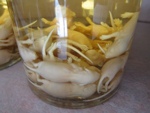 Doslova – lidi je prostě seberou jejich milujícím myším maminkám a zaživa je nahážou do flašek s kořalkou. Myšátka se tam nechají pár měsíců fermentovat, čímž vznikne asijská obdoba mescalu. ‚Opilá myšátka‘ se ale na rozdíl od červů nejedí.