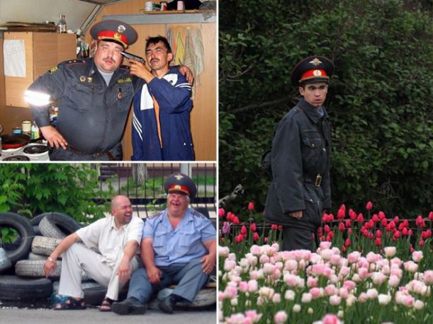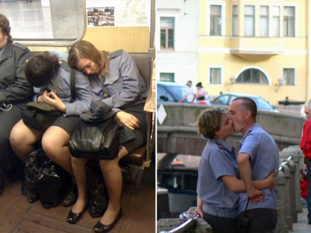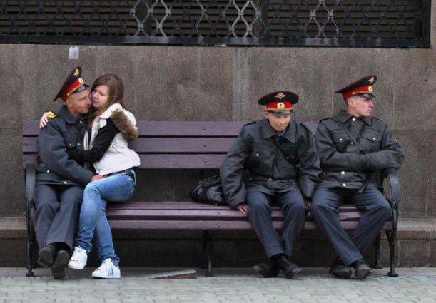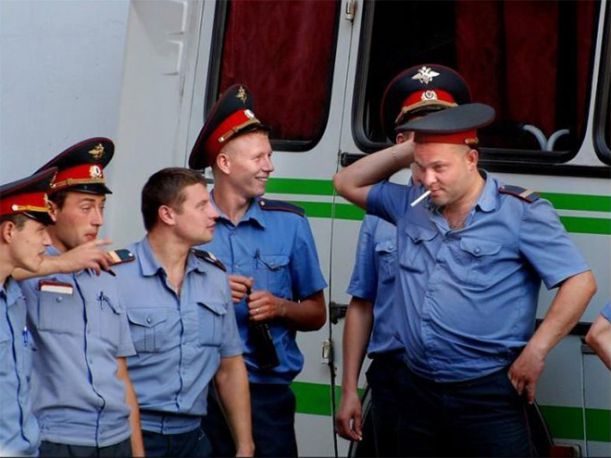 Když tento vtip zaslechli v nálevně dva policajti, zvedli se od stolu a jdou ke skupince ‚pachatelů‘: „Tak pánové, vaše legitimace,“ vyzývá je jeden. Když je dostane, začne jimi listovat a obrátí se na svého kolegu: „Serjožo, piš.“