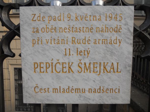 Vypadá to snad až směšně, ale není to k smíchu. (Foto: Ivan Brezina) Opravenou mramorovou desku se zlatými písmeny najdete na Křižovnickém náměstí přímo za zády bronzové sochy Karla IV. Otce Vlasti. Kolega Vondráček po Pepíčkově osudu před lety pátral. Zjistil, že jedenáctiletý „mladý nadšenec“ v květnu 1945 vyběhl vítat Rudou armádu tak nadšeně, až mu ujely nohy a spadl pod pásy tanku. Jeho tělo pak několik dnů leželo v márnici, až ho konečně našli rodiče.