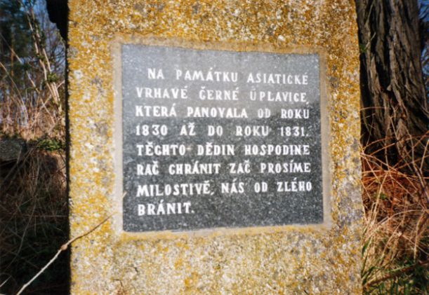 Dnes přichází z Asie místo cholery levné plastové zboží. (Foto: Ivan Brezina)„Morový křížek“ s podivným nápisem stojí na kraji jedné z vesniček tzv. Českého Meranu – oblasti mezi Miličínem a Jistebnicí. Co to bylo za divnou nemoc, která tu dvěma stoletími kosila lidi po stovkách? Dr. Jaroslav Spirhanzl Duriš v článku Za krásami Českého Meranu (1934) vysvětluje: „Hrozná epidemie cholery vznikla roku 1817 na indickém Gangu a zničila tehdy téměř celou Východní Indii. Přes Ceylon (1818) a Siam (1819) přešla do Číny (1820), Persie a Sýrie (1822) a jižního Ruska (1830), aby přes Polsko a Halič zasáhla pak i k nám. Podle současných zápisů »první známkou nemoci byly křeče, jež tak sevřely, že člověk jako uhel zčernal, pak silné vrhání a smrtelný průjem«. Pomoci proti úplavici neznal nikdo. Pili kořalku s pepřem, vodu, koňskou moč, dávali se zakopat do čerstvého koňského hnoje – ale umírali přece houfně. Podle ústního podání byly oběti úplavice na těchto drahách hromadně pohřbívány – což však není pravděpodobné. K morovému křížku se koná vždy o Petru a Pavlovi (29. června) procesí z Jetřichovic, procesí slavné, s družičkami a hudbou. Po návratu je ve vsi muzika. Oslavujeme tedy památku mrtvých zcela v duchu staroslovanském.“