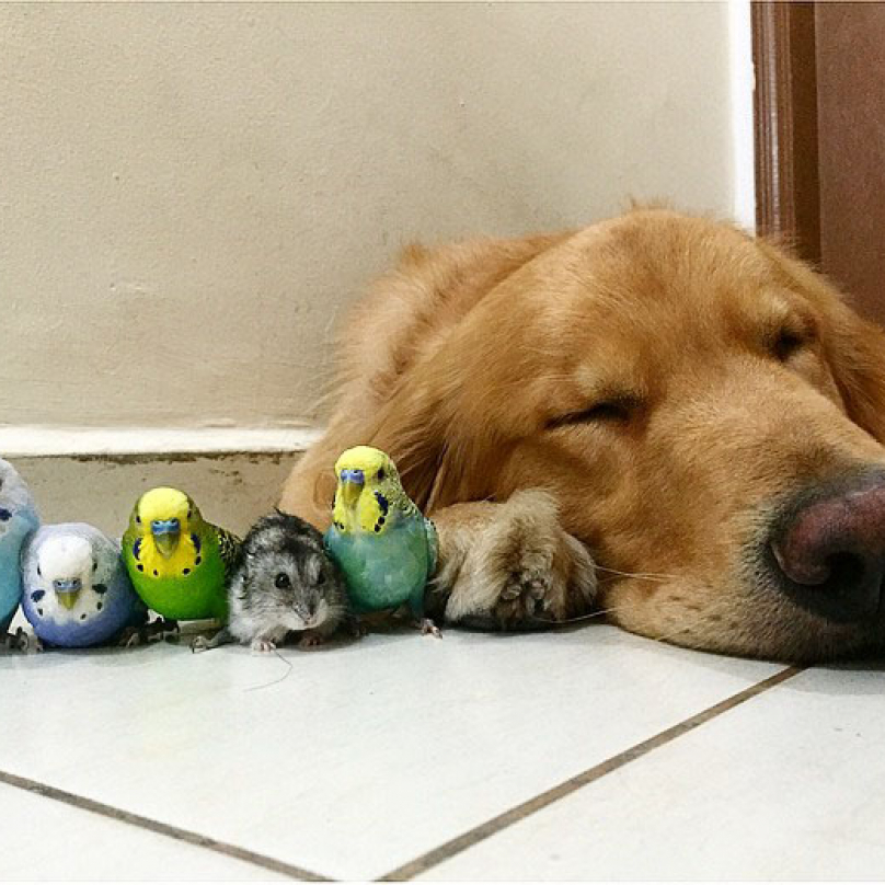 Máme tady jednoho zlatého retrívra (Avifer aureus), jednoho křečka syrského šedého (Mesocricetus auratus, kombinace alel ‚barvonosných‘ genů SgSg), dvě korely chocholaté (Nymphicus hollandicus) ve světlé mutaci, dvě zebřičky pestré (Taeniopygia guttata) a čtyři andulky vlnkované (Melopsittacus undulatus) v různobarevných mutacích.