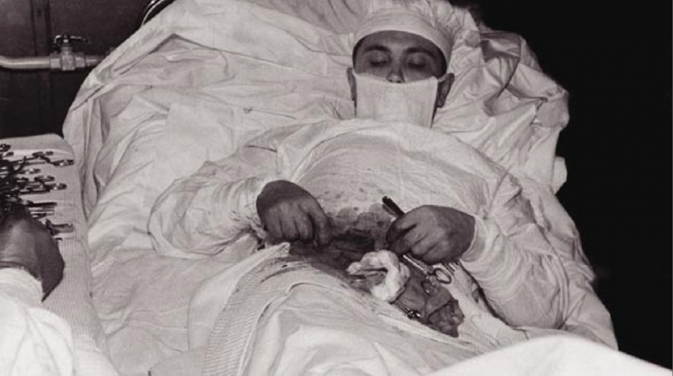 „Pracoval jsem bez rukavic. Bylo na to špatně vidět. Zrcadlo sice pomáhalo, ale zároveň fungovalo i kontraproduktivně – koneckonců ukazovalo věci převráceně. Pracuji hlavně dotykem. Krvácení je celkem masivní, ale snažím se pracovat jistě. Jak jsem si otevíral pobřišnici, zranil jsem střevo, které jsem musel zašít. Najednou mi blesklo myslí: zranění je víc, ale nevšiml jsem si jich... Jsem slabší a slabší, začíná se mi točit hlava. Každých 4 až 5 minut si musím na 20 až 25 vteřin odpočinout.