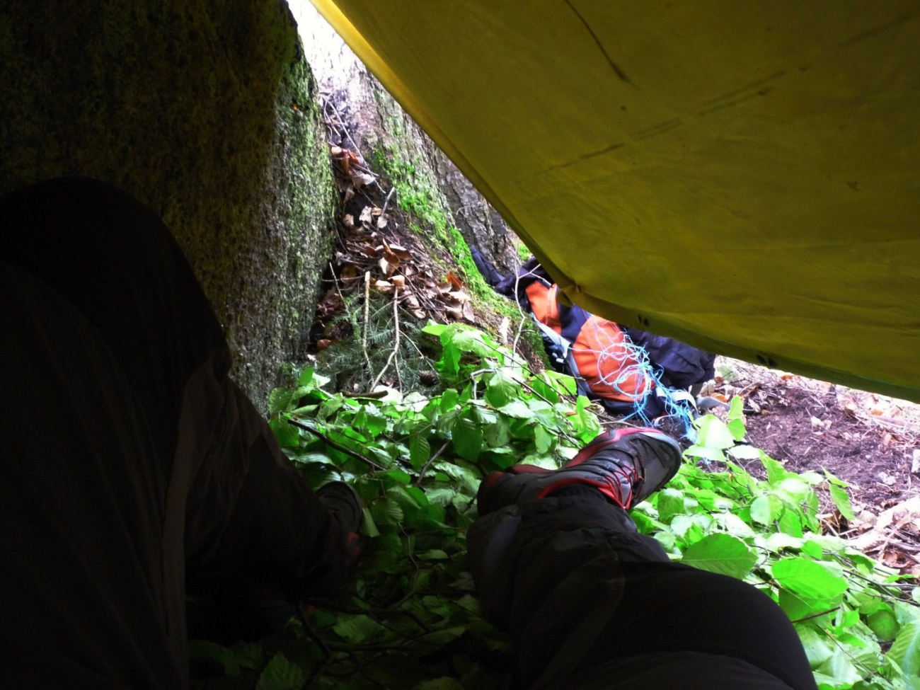 Pohled zpod celty při spaní ve Voděradských bučinách