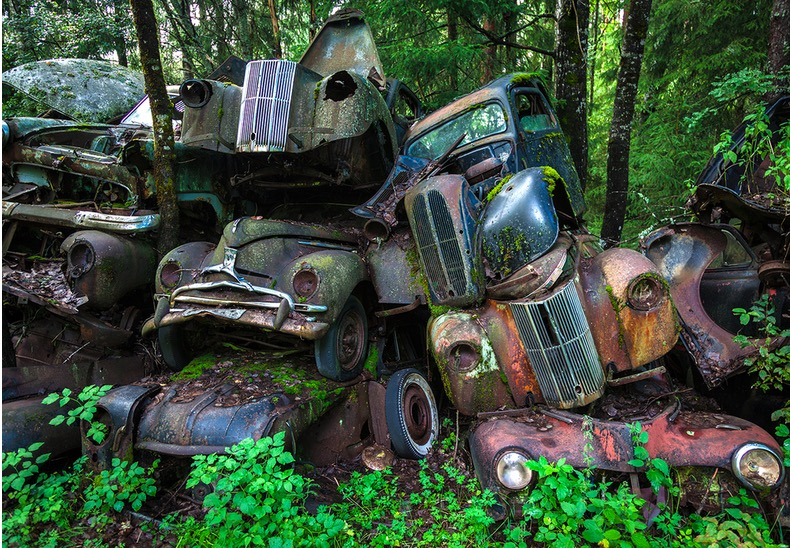 Hluboko v lese jsou auta vyrovnaná do přesných řad, často naskládaná i ve třech patrech na sobě.
