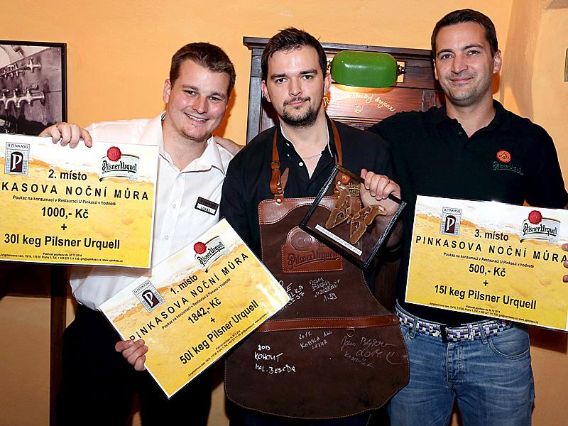 Vítězové posledního ročníku 2014. Co dát výčepákům za odměnu? Ještě víc piva! Vlevo: Lukáš Pešík - restaurace u Pinkasů (druhé místo). Uprostřed: Jan Bejšovec - Konvikt (první místo). Vpravo: Tomáš Rédl - Šenk na Parkánu (třetí místo) pravapraha.cz
