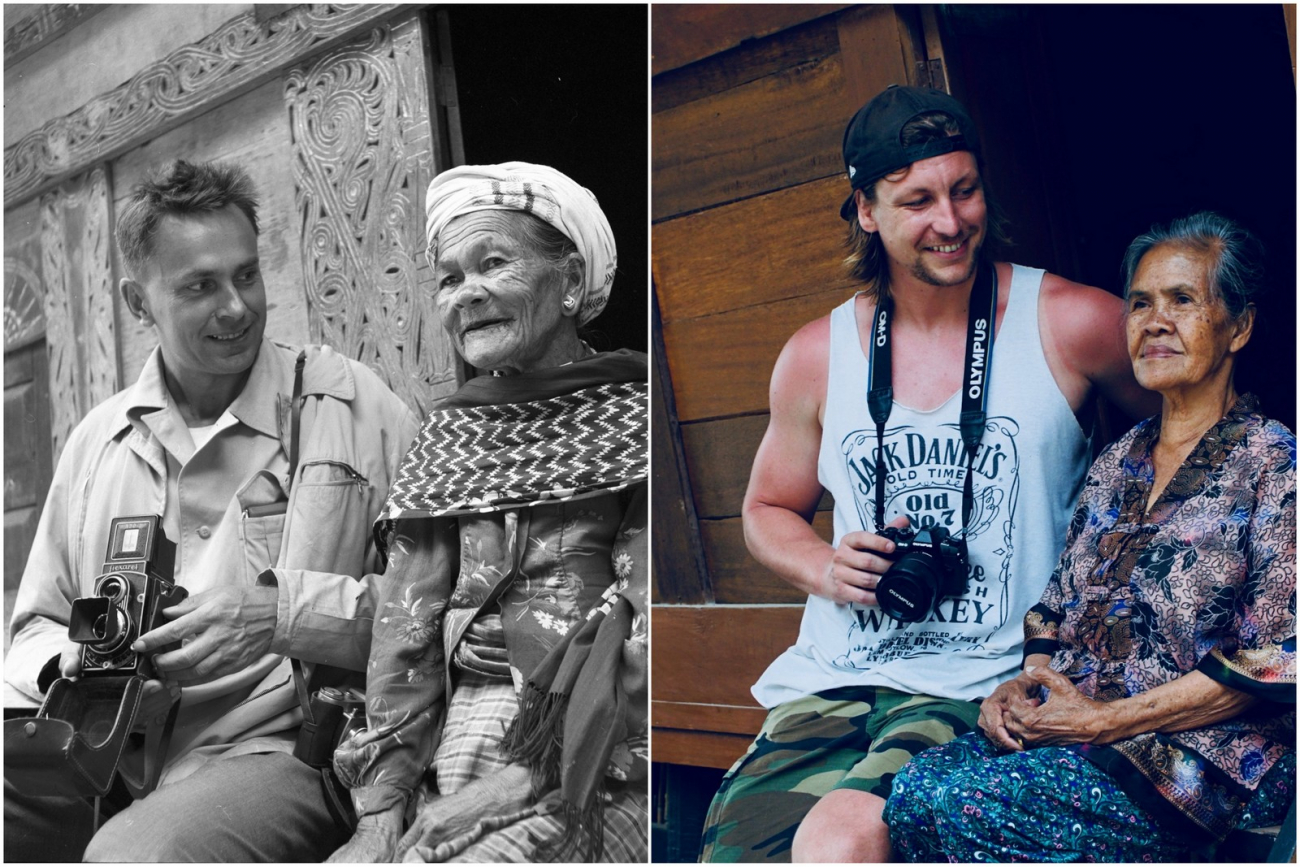Na snímku vlevo Miroslav Zikmund a žena ze Sumatry. Vpravo Tomáš Vaňourek s vnučkou ženy z předchozí fotografie. G.cz koláž