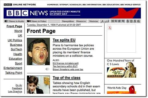 Britská veřejnoprávní televize to vždy myslela s webem vážně, však se podívejte na pečlivou grafickou úpravu z roku 1998. To není jako web amerických prezidentů...