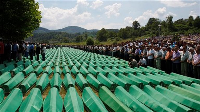 Každý rok se v Srebrenici koná pohřeb desítek zeleným suknem pokrytých rakví.