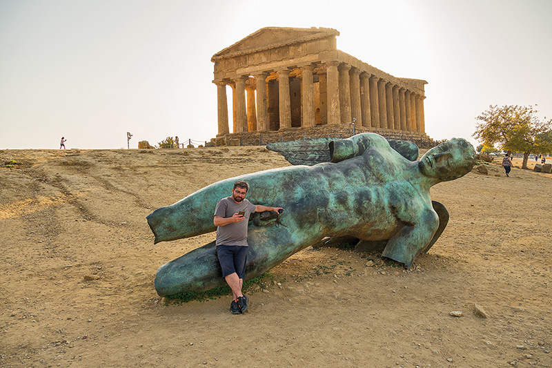 Antické památky v Agrigentu patří mezi ty nejlépe zachované. Socha je samozřejmě současná.