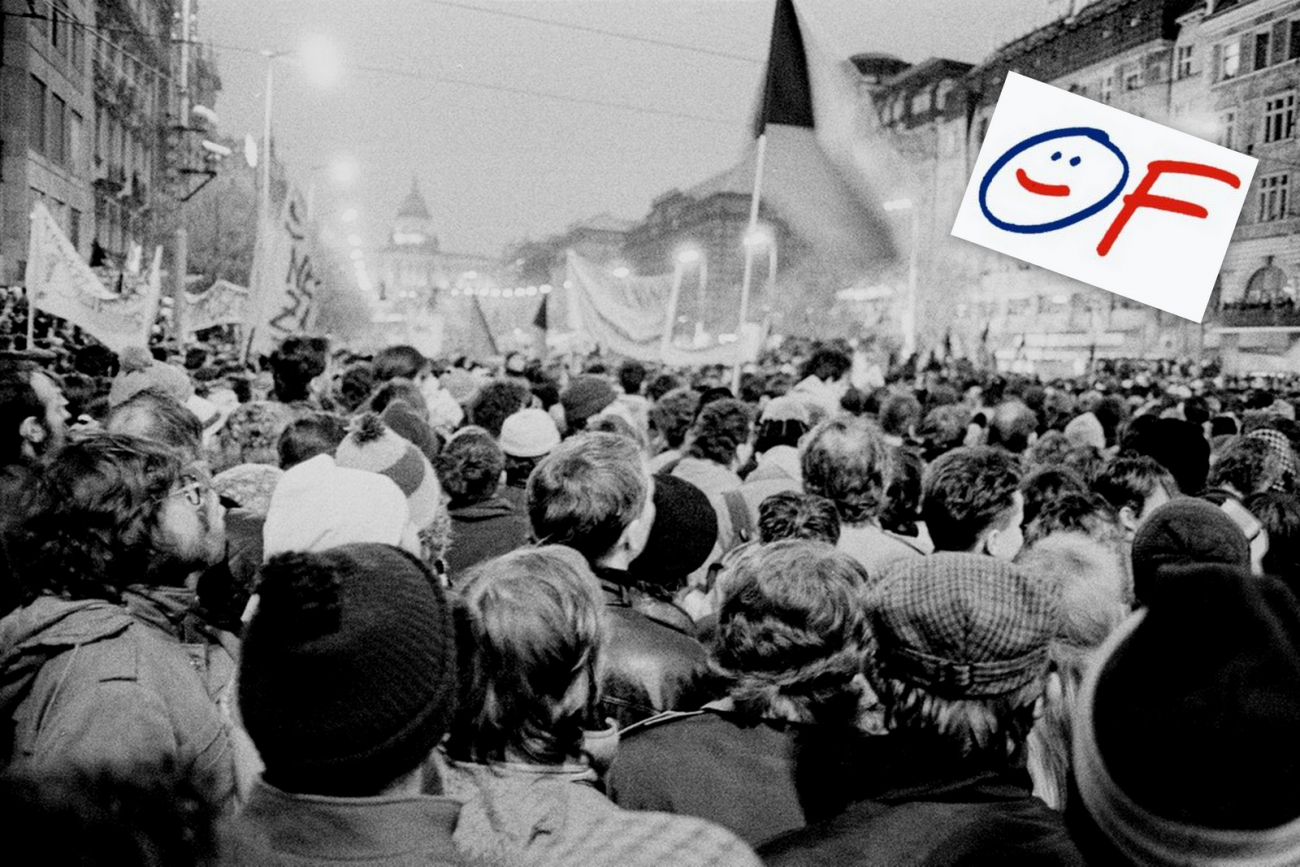 Shromáždění konané dne 25. listopadu 1989 na Václavském náměstí. Z balkonu Melantrichu promlouvali k lidem zástupci Občanského fóra.