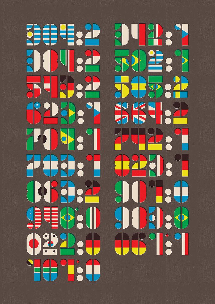 Praktická pomůcka, zobrazující místa, soupeře a výsledky všech finále mistrovství světa ve fotbale.