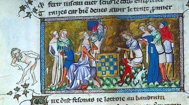 Muž nalevo s prstem v ... The Vows of the Peacock c. 1350.