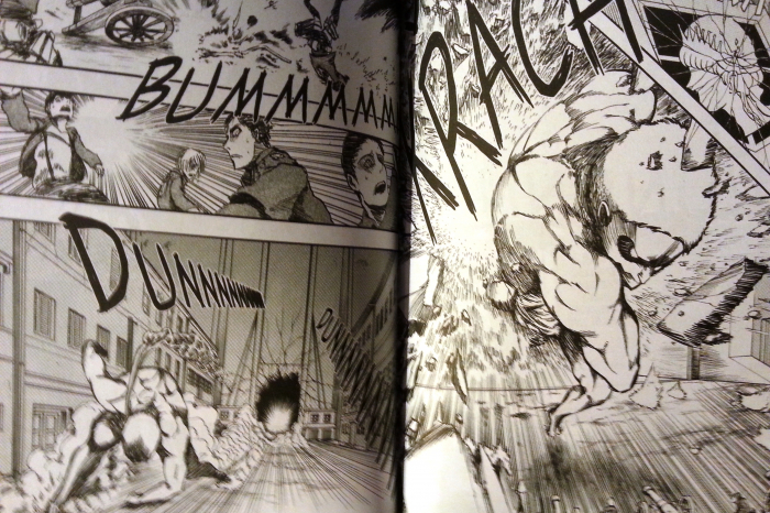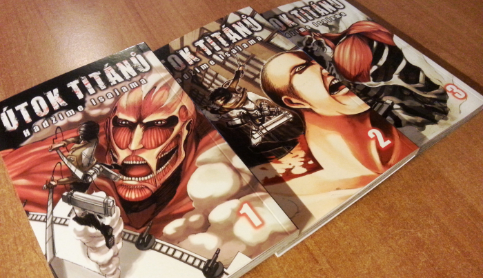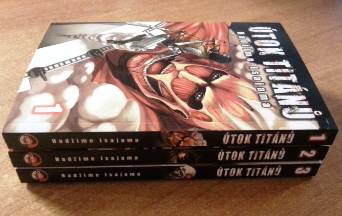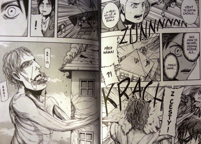 Prozatím u nakladatelství Crew vyšly tři díly manga, autor sám slibuje přes dvacet svazků. Není to taková tragédie jako u Naruta, který má přes sedmdesát knih. Sama nemám moc v oblibě přebytečné kvantum postav, které navíc v Isajamově kresbě občas nelze dobře pochytit, ale některé z nich časem začnou být docela sympatické. Obzvlášť když se zvládnete prokousat prvními třemi díly. S kresbou se podle mě Isajama v každé knize zlepšuje, i když je akce místy pořád dost nepřehledná. Aby to od začátku až do konce nebyl jen samý boj, požírání lidí a umírání, dávkuje do děje průběžně vzpomínkové flashbacky. Je vcelku dobrým vypravěčem. Tedy, dobrým…