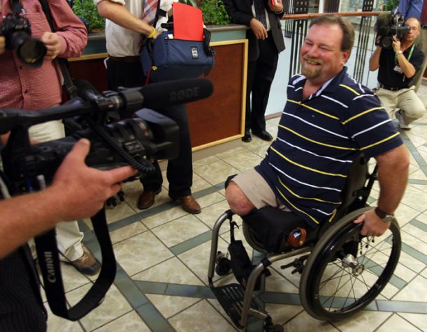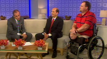 Příjezd do televizních studií NBC v New Yorku pět let po nehodě. Oddělit tak spodní polovinu fotky, nepoznali byste, že Trumanovi něco schází – natož celá spodní polovina těla. (Foto: NBC)