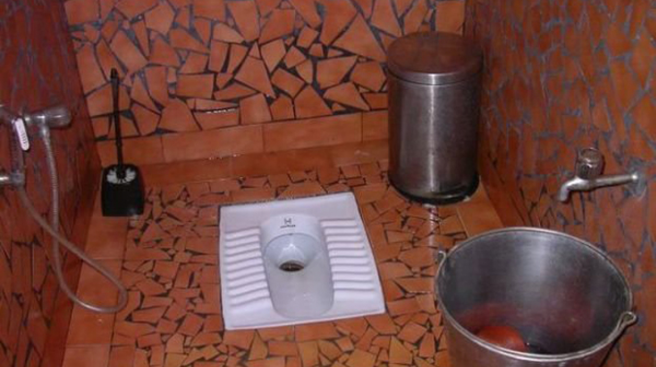Dražší hotelové pokoje, označované někdy jako „western“, mívají někdy sedací „evropský“ záchod. V levnějších hotelích a ve vlacích jsou jinak „turecké“ záchody (díra v zemi a dvě betonové či keramické šlapky). Existuje lékařská teorie, podle které je použití tohoto typu toalety přirozenější a zdravější než naše "trůnění" – při vyprazdňování „na bobku“ prý totiž člověk tolik nenamáhá břišní svaly. Miliony let to ostatně lidé dělali právě takhle, sedací záchod je vynálezem změkčilé civilizace. Především si pěkně roztáhnete při dřepění půlky, obsah z vás vylítne a zase jdete.