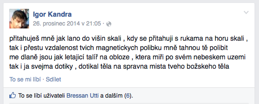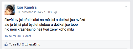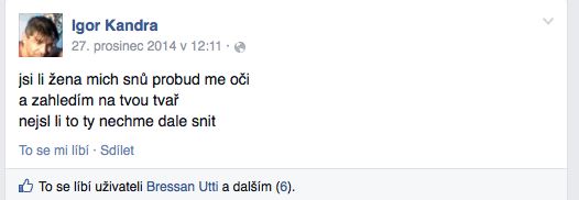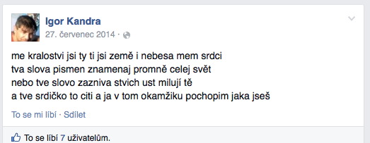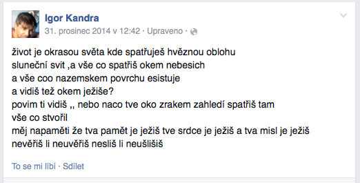 Čas od času se někde vynoří insitní umělec, nad jehož tvorbou si jen překvapeně řeknete: “Týýýý vole!” Třeba Igor Kandra. Našel jsem ho úplně náhodou na Facebooku a vůbec netuším, kdo to je. Ale v tom člověku je obrovský tvůrčí přetlak, který se zoufale dere ven. Je to brutální kýč a grafomanský blábol, nebo naivistická krása, kterou se jednou budou zabývat literární teoretici (podobně jako třeba Ladislavem Klímou nebo Bohumilem Hrabalem)? Posuďte sami: