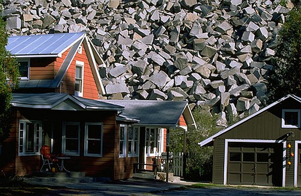 Lom je obklopen městečkem, které tu v průběhu desetiletí vyrostlo. Chatrné domečky s veškerým zázemím jsou obklopeny kopci z hrubě nalámané žuly, která se k ničemu nehodí. Je stará třicet let. Přesně tehdy se ukázalo, že už ji není kam dávat, a tak v Rock of Ages zainvestovali do obří drtičky. Drcená žula dnes slouží k vyspravování silnic a chodníků v širokém okolí lomu.