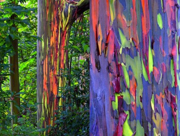 Blahovičník oloupaný (Eucalyptus deglupta) – můžete si ho koupit a pěstovat klidně i u nás. Barevný jev vzniká samovolným loupáním kůry v pruzích a obnažování různě barevného lýka. Barevnost lze posílit správným použitím photoshopu.