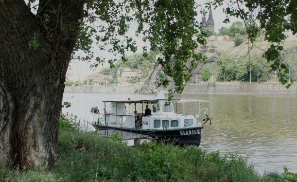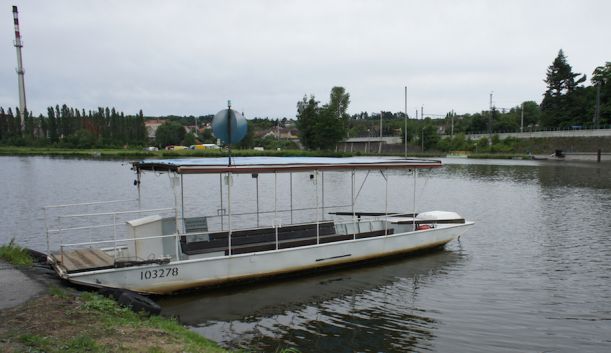 Loď: prám s horním vodičem (loď je jištěna ‚drátem‘ a poháněna pouze říčním proudem)