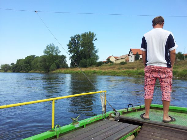 Převozník Libor Horák je málomluvný, ale zase je to bývalý kapitán remorkéru. Řekl nám jen, že o víkendech je tu hodně cyklistů a největší rachot je na