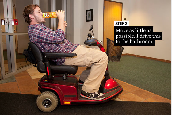 3. "Druhý krok: omezte veškerý pohyb. Například já se takto dopravuji k toaletě."