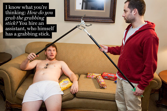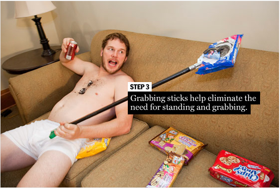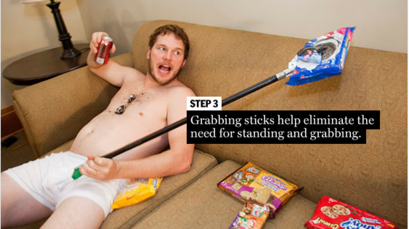 4. "Třetí krok. Hůl s klepetem vám pomůže omezit zbytečnou cestu z gauče a další nezbytný pohyb pro získání potravin ve vašem okolí."