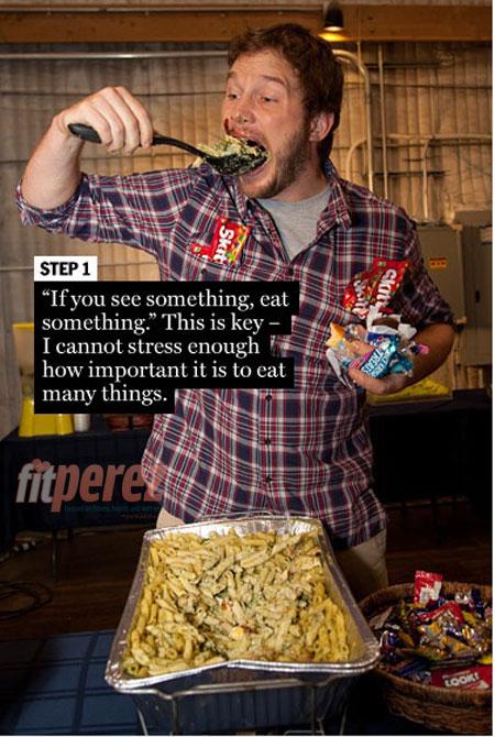 2. Jak se přiblížit tomuto ideálu? Chris Pratt radí: "První krok, sežerte všechno, na co narazíte. To je základ - jinak to nelze vyjádřit - je důležité žrát jako utrhnutý z řetězu."
