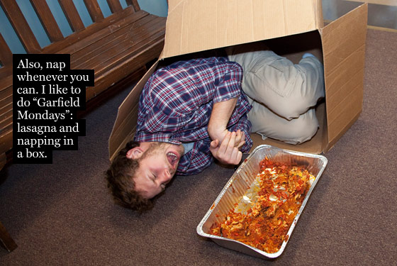 8. "K tomu všemu doporučuji průběžné malé šlofíky. Nejlepší jsou Garfieldovy pondělky - lasagne a šlofík v krabici."